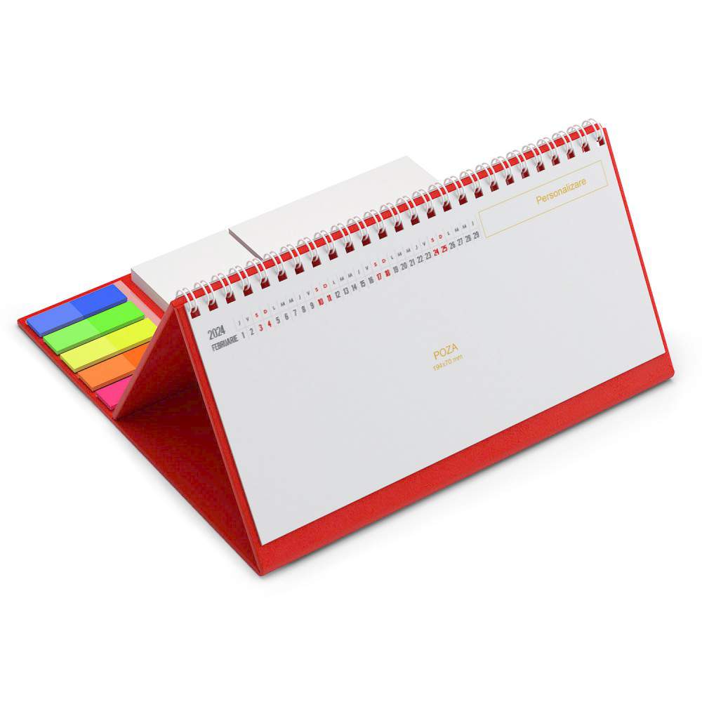 Calendar de birou cu notite repozitionabile. Calendarele se personalizeaza pe fiecare fila, fata verso, policromie si se face in locurile indicate. Puteti tipari sigla, slogan, adresa si fotografii. Personalizarea se poate realiza si pe suportul de mucava, caserat.