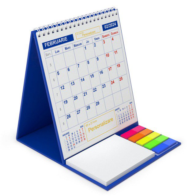 Calendar de birou cu notite repozitionabile. Calendarele se personalizeaza pe fiecare fila, fata verso, policromie si se face in locurile indicate. Puteti tipari sigla, slogan, adresa. Personalizarea se poate realiza si pe suportul de mucava, caserat.