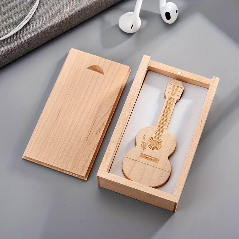 Unitate flash USB 2.0 din chitara de lemn, cu ambalaj din cutie de lemn.